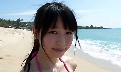 slim japonés gal tsukasa arai se ambienta en una playa de arena bajo el sol